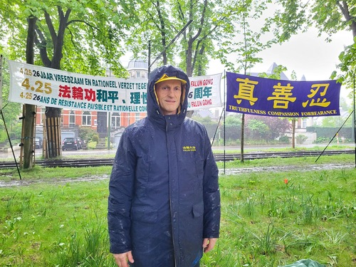 ویلفرد در رویدادی نزدیک سفارت چین در بلژیک، برای روشنگری حقیقت درباره آزار و شکنجه شرکت میکند.