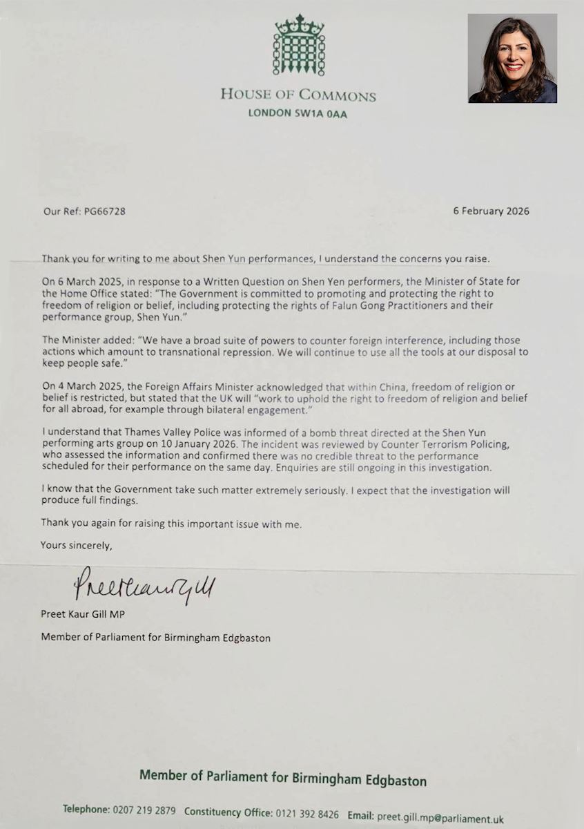 پریت کائور گیل، نماینده پارلمان از بیرمنگام اجبستون، نوشت: «در ۶مارس۲۰۲۵، وزیر دولت در وزارت کشور، در پاسخ به یک پرسش مکتوب درباره اجراگران شن یون اظهار داشت: "دولت متعهد به ترویج و حفاظت از حق آزادی مذهب یا عقیده است، ازجمله حفاظت از حقوق تمرینکنندگان فالون گونگ و گروه نمایش هنری آنها، شن یون."»