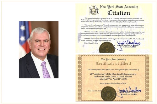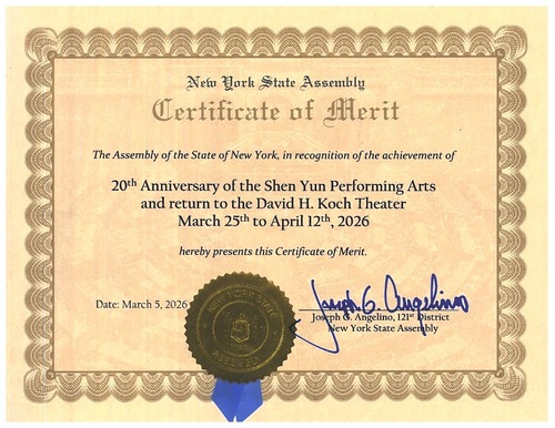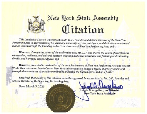 (Minghui.org) هنرهای نمایشی شن یون از ۲۵ مارس تا ۱۲ آوریل ۲۰۲۶ با برنامههای جدید برای فصل ۲۰۲۶ به سالن تئاتر دیوید اچ کوخ در شهر نیویورک باز خواهد گشت. جوزف آنجلینو، عضو مجلس ایالتی نیویورک، اخیراً با اهدای تقدیرنامهای به افتخار مدیر هنری شن یون و گواهی شایستگی، بیستمین سالگرد تأسیس این شرکت هنرهای نمایشی و بازگشت آن به مرکز لینکلن را به رسمیت شناخت.