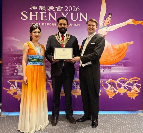 مجید حسین، شهردار شهر های وایکام در تاریخ 26 فوریه 2026 گواهی قدردانی به شن یون را در تئاتر سوان شهر وایکام اهدا میکند.