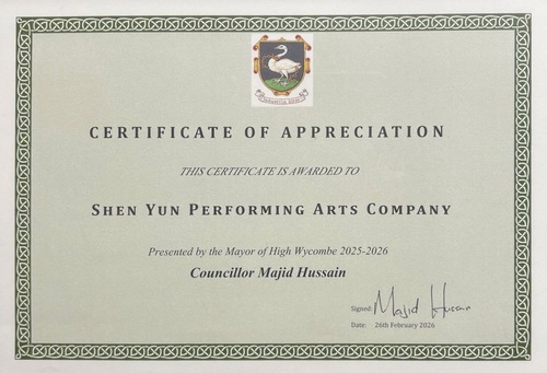 (Minghui.org) شرکت جهانی هنرهای نمایشی شن یون در 21 فوریه 2026 در تئاتر سوان وایکام در های وایکام، انگلستان، در سالنی مملو از جمعیت اجرا کرد. شهردار مجید حسین به خاطر عملکرد برجسته و کمک فرهنگی به جامعه محلی یک گواهینامه قدردانی به این شرکت اهدا کرد.