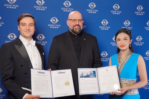 جان کواچ (در مرکز)، معاون شهردار و عضو شورا، در تئاتر نامه تقدیر را به شن یون ارائه کرد و اجرای آن را تماشا کرد. (انتیدیتیوی)