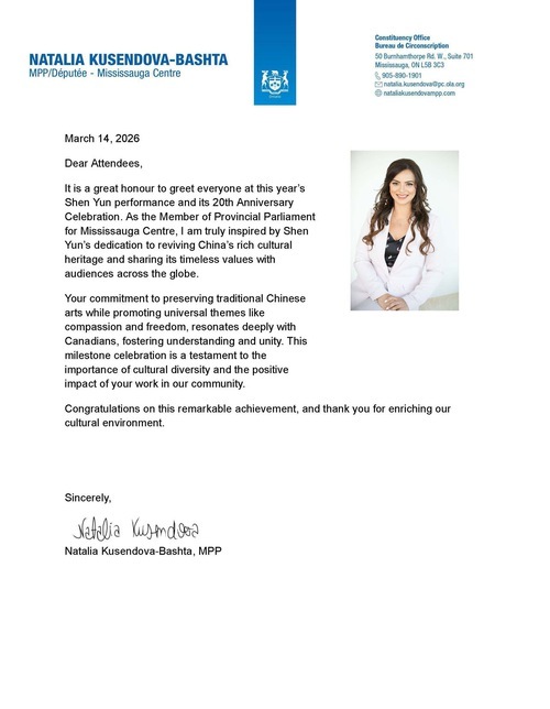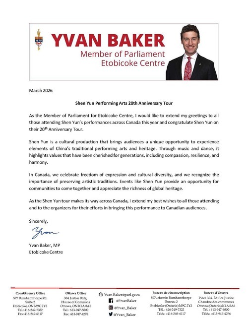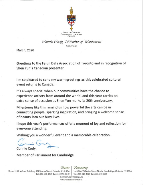(Minghui.org) شرکت هنرهای نمایشی شن یون، که در سطح جهانی شهرت دارد، در ۱۲مارس۲۰۲۶ برای اجرای تور ۲۱ نمایشی خود وارد کانادا شد؛ توری که از همیلتون، انتاریو آغاز شد. پیش از اجراها، مقامات منتخب در سطوح مختلف با صدور اعلامیهها یا ارسال نامههای تبریک، بازگشت شن یون به کانادا را خوشامد گفتند. آنها بیستمین سالگرد شن یون را تبریک گفتند و برای این شرکت آرزوی موفقیت کردند. شمار زیادی از مقامات در این اجراها حضور یافتند و اعلامیههایی ارائه کردند.