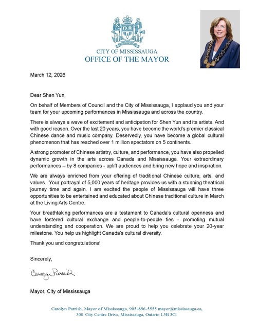 او در نامهای ادامه داد: «شما بهعنوان ترویجدهندهای قدرتمند برای هنر، فرهنگ و اجرای چینی، رشد پویایی را در عرصه هنر در سراسر کانادا و میسیساگا نیز پیش بردهاید. اجراهای فوقالعاده شما—توسط ۸ شرکت—تماشاگران را تعالی میدهند و امید و الهام تازهای به ارمغان میآورند.