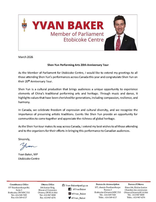 ایوان بیکر در نامه تبریک خود اظهار داشت: «در کانادا، ما آزادی بیان و تنوع فرهنگی را گرامی میداریم و اهمیت حفظ سنتهای هنری را به رسمیت میشناسیم. رویدادهایی مانند شن یون فرصتی را فراهم میکنند تا جوامع گرد هم آیند و غنای میراث جهانی را ارج نهند.»