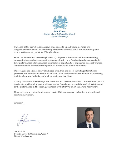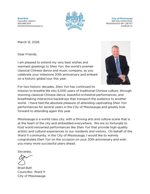 براد بات، عضو شورای شهر میسیساگا، نامه تبریکی به شن یون ارائه کرد و در بعدازظهر ۱۴مارس۲۰۲۶ اجرای آن را تماشا کرد. (اپک تایمز)