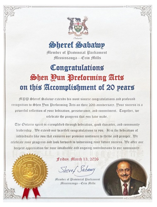 شریف صباوی، عضو پارلمان استانی (MPP) برای میسیساگا-ارین میلز، در اعلامیه خود نوشت که تبریکات و قدردانی صمیمانه خود را به شرکت هنرهای نمایشی شن یون به مناسبت بیستمین سالگرد آن ابراز میکند. او نوشت: «موفقیت شما بازتابی قدرتمند از تعهد، پشتکار و پایبندی شماست. ما با هم پیشرفتی را که بهدست آوردهاید جشن میگیریم.»