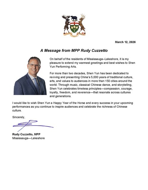 رودی کوزتو، عضو پارلمان استانی انتاریو، نامه تبریکی در تمجید از شن یون ارسال کرد. (اپک تایمز)