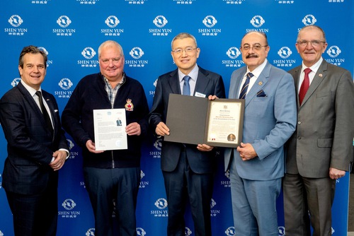 در بعدازظهر ۱۴مارس۲۰۲۶، شریف صباوی (دوم از راست)، عضو پارلمان استانی انتاریو، در تئاتر جایزهای به شن یون اهدا کرد و اجرای آن را تماشا کرد. سایر مقامات در عکس عبارتاند از: استیون داسکو، عضو شورای شهر میسیساگا (اول از چپ)، براد بات، عضو شورای شهر میسیساگا (دوم از چپ)، و ولادیسلاو لیزون، نماینده پیشین پارلمان (اول از راست). (اپک تایمز)