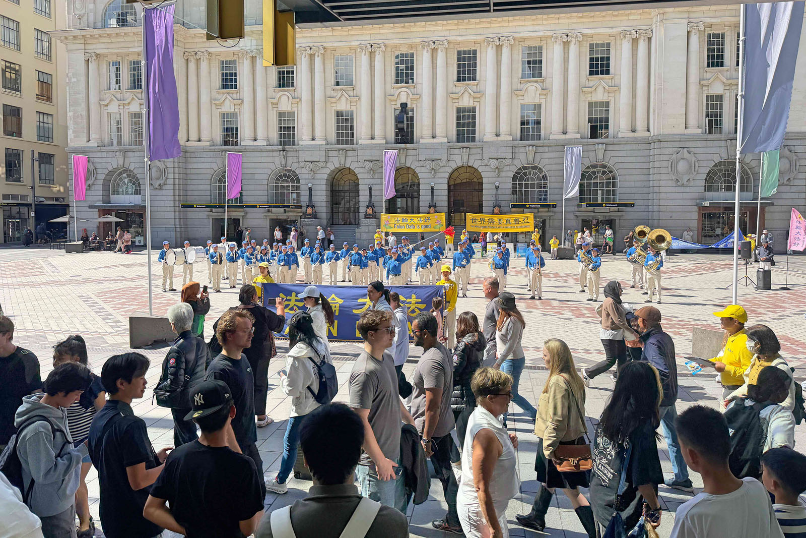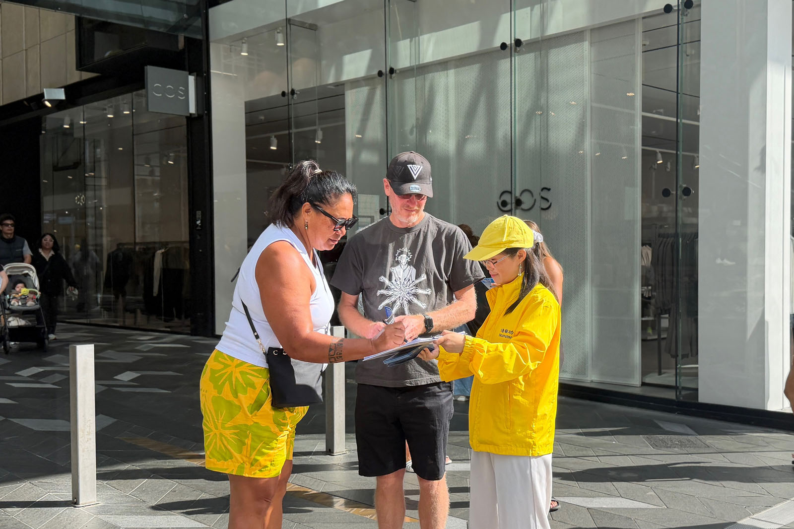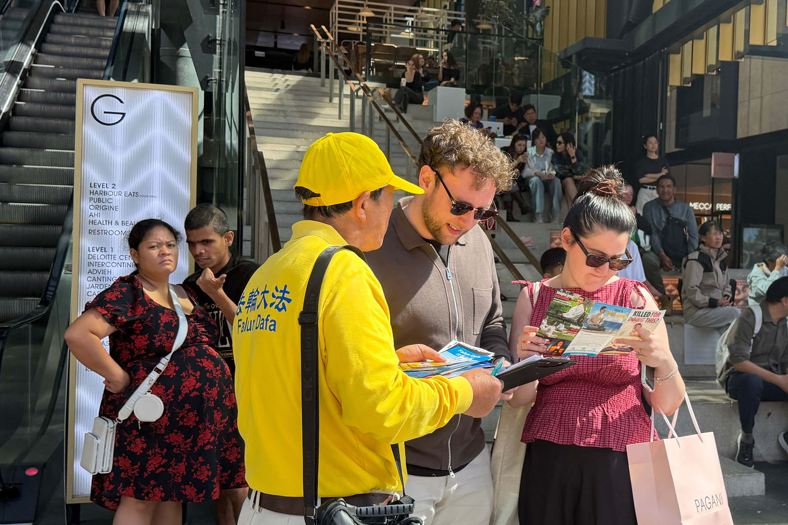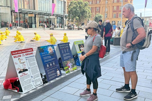 گردشگران، خریداران و سایر رهگذران برای تماشا توقف میکردند، عکس میگرفتند، تابلوهای نمایش را میخواندند و با تمرینکنندگان صحبت میکردند تا درباره فالون دافا و مزایای تمرین آن اطلاعات کسب کنند. آنها همچنین درباره آزار و اذیت ح.ک.چ اطلاعات کسب کردند.