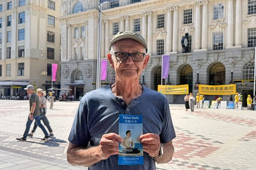 رهگذری اطلاعات فالون دافا را میخواند.