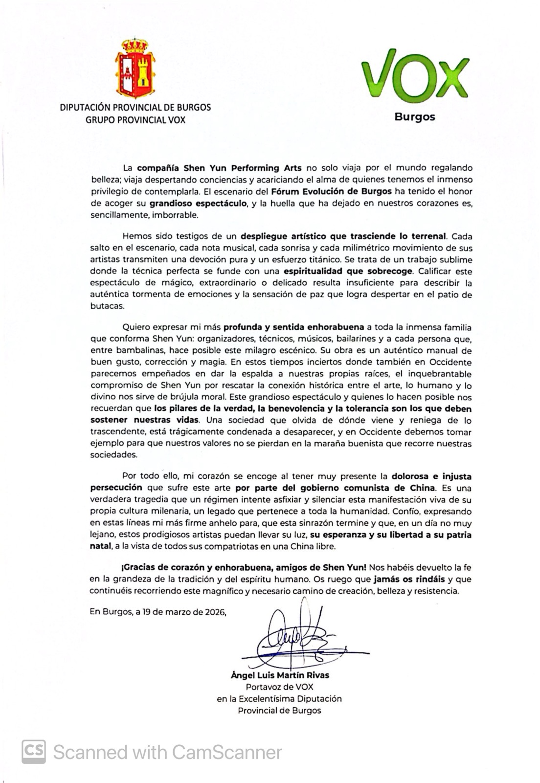 اعضای شورای استان بورگوس در ۱۹ مارس ۲۰۲۶ اعلامیهای را به هنرهای نمایشی شن یون ارائه دادند. در این اعلامیه آمده است: