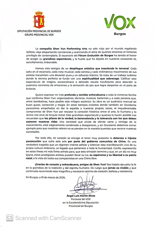 اعضای شورای استان بورگوس در اسپانیا در ۱۹ مارس ۲۰۲۶ اعلامیهای را به هنرهای نمایشی شن یون تقدیم کردند.