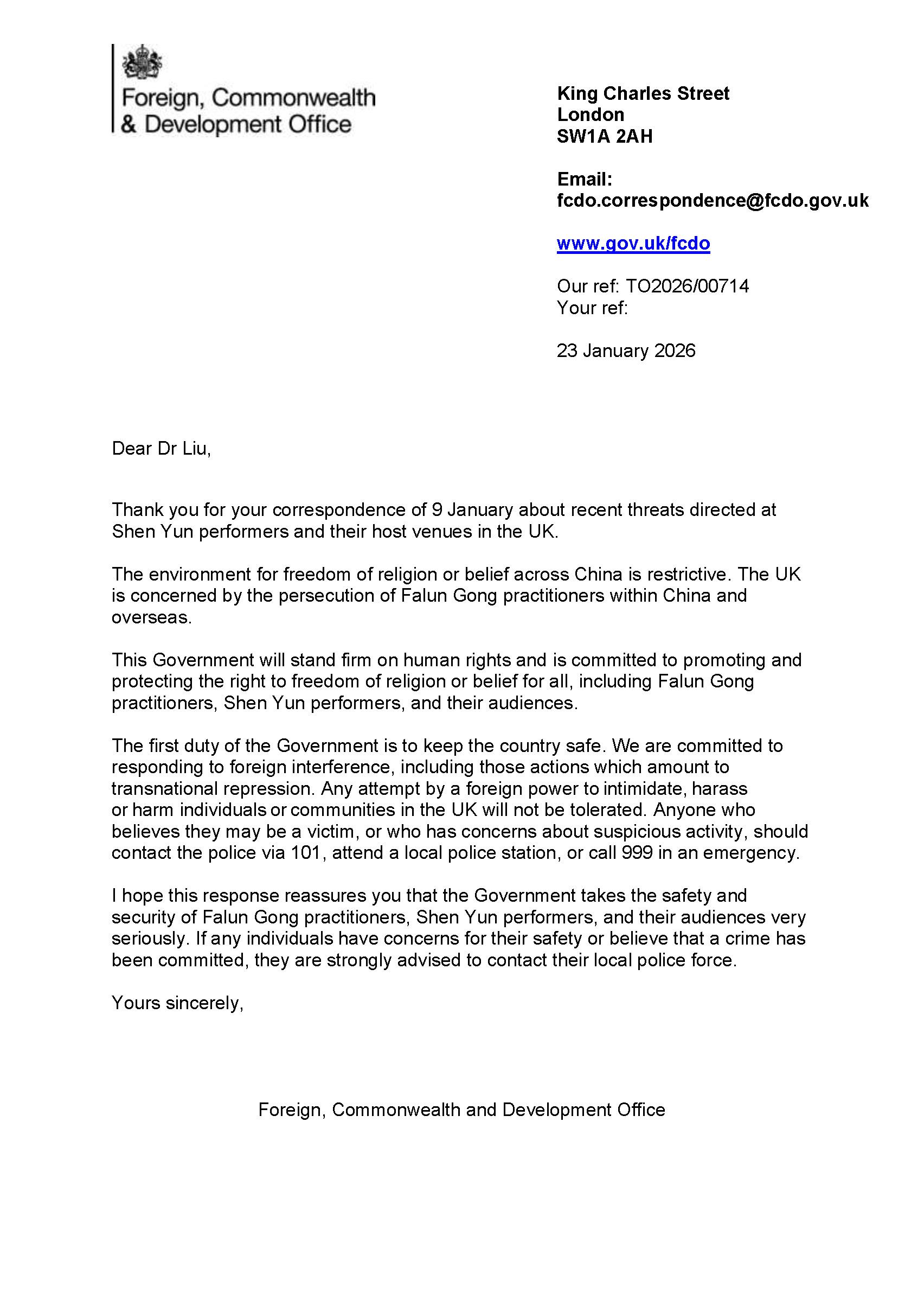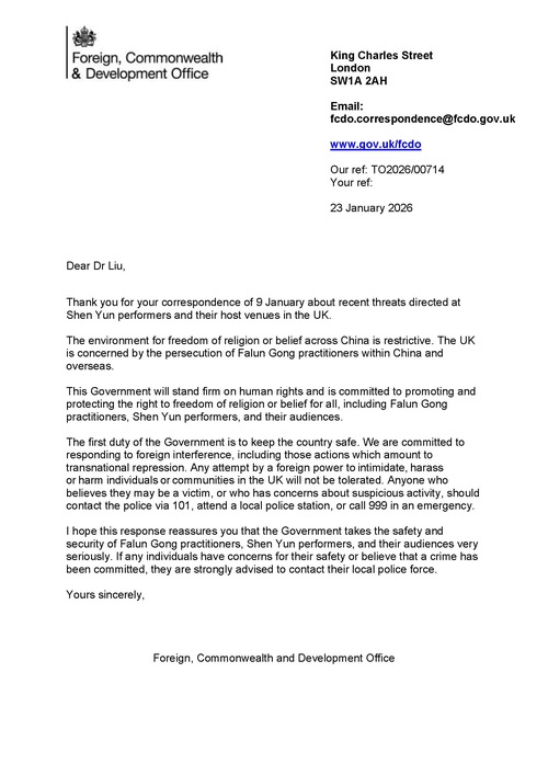 پس از دریافت تعدادی تهدید توسط تئاترها، دفتر امور خارجه، کشورهای مشترکالمنافع و توسعه در ۲۳ ژانویه نامهای به انجمن فالون دافای بریتانیا، میزبان اجراهای شن یون، ارسال کرد.