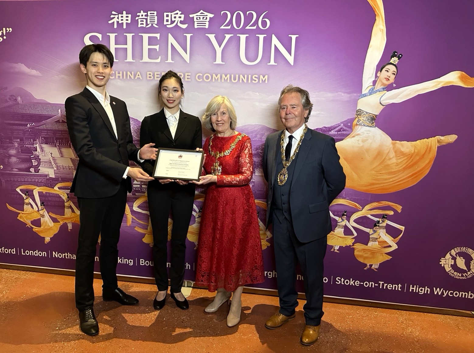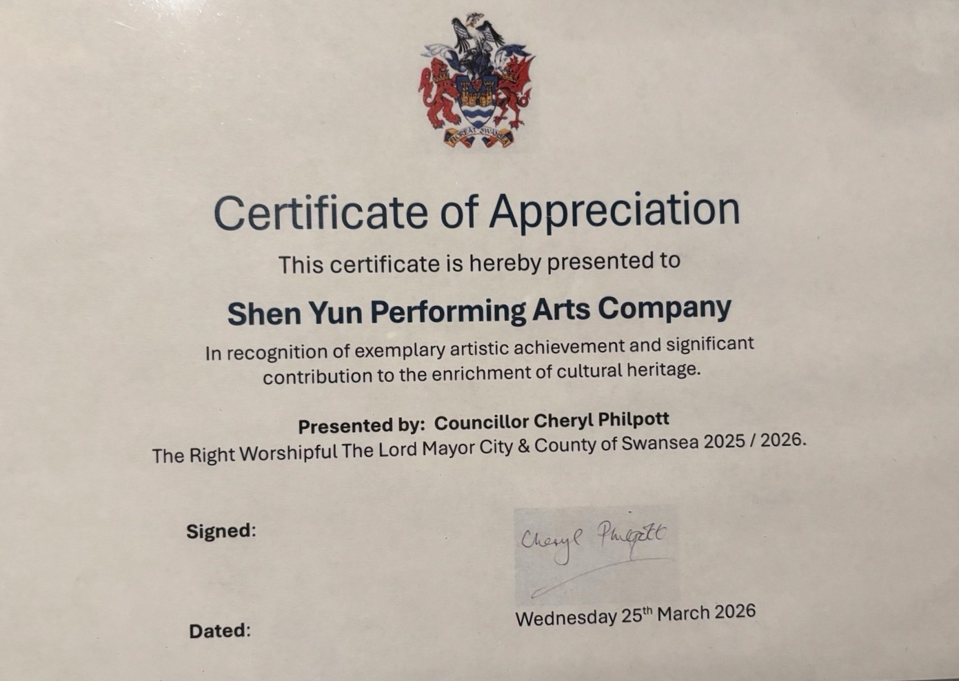 شریل فیلپات، شهردار سوانزی، و همسرش در ۲۵ مارس در سالن اجتماعات ساختمان سوانزی، تقدیرنامهای را به هنرمندان شن یون اهدا کردند.