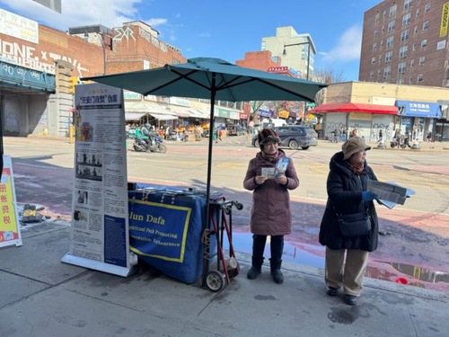 تمرینکنندگان در نیویورک پنج غرفه در خیابان مین در فلاشینگ، یکی از بزرگترین جوامع چینی در شهر، برپا کردهاند تا درباره فالون گونگ به مردم اطلاعرسانی کنند و تبلیغات افتراآمیز ح.ک.چ را رد کنند. آنها در هر شرایط آبوهوایی همچنان به مردم درباره فالون گونگ و اینکه ح.ک.چ چگونه آن را آزار و شکنجه میکند اطلاعرسانی میکنند.