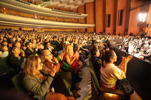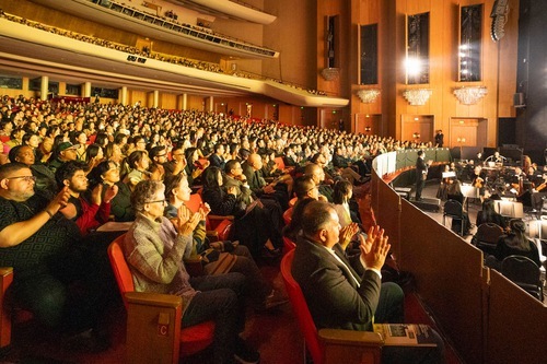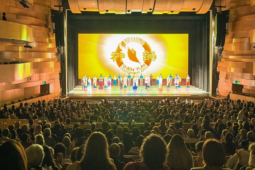 تماشاگران پس از اجرای شبانه شرکت هنرهای نمایشی شن یون آمریکای شمالی در پاویلیون دوروتی چندلر در مرکز موسیقی لسآنجلس، کالیفرنیا در ۲۳ژانویه تشویق میکنند.