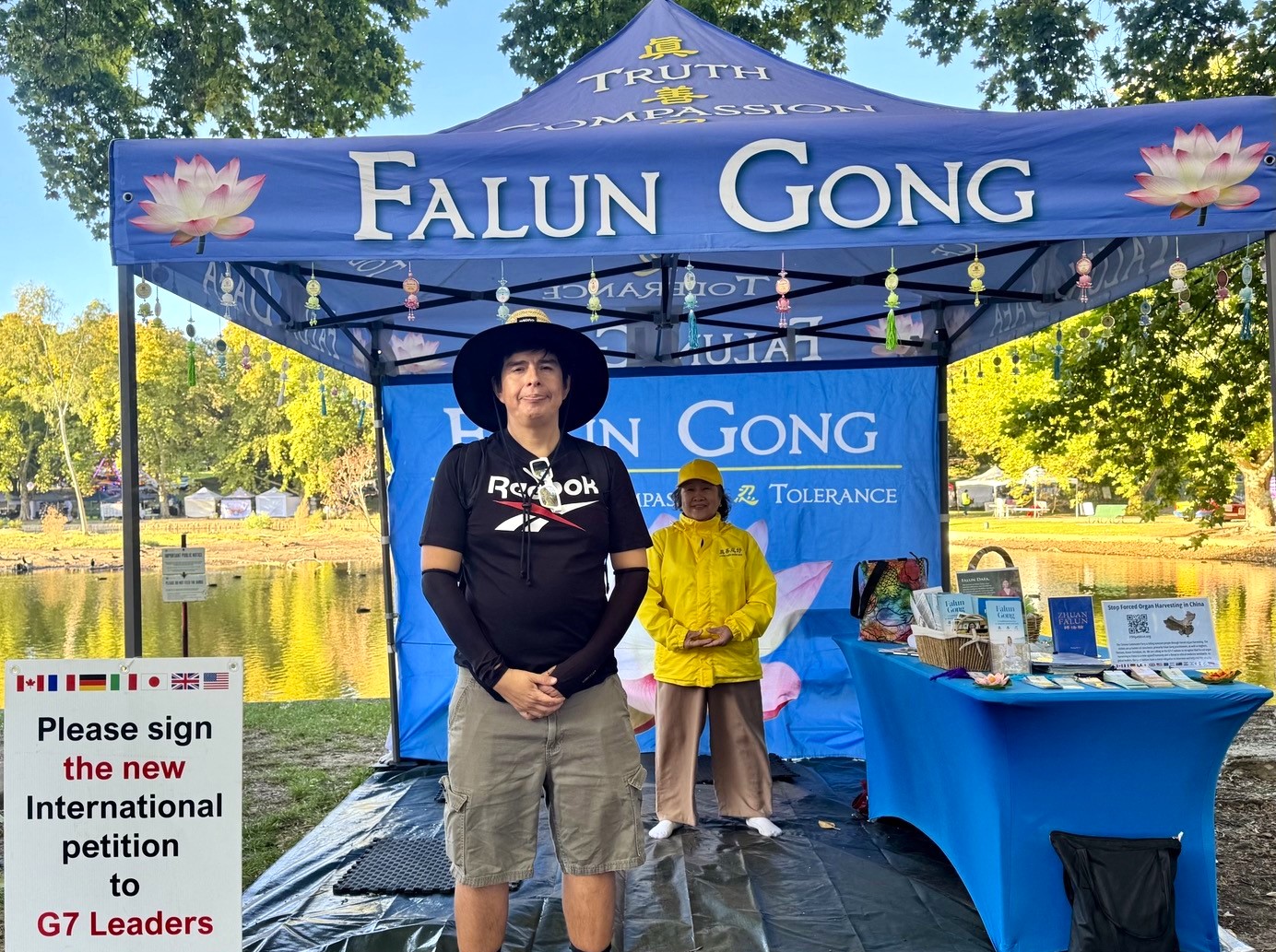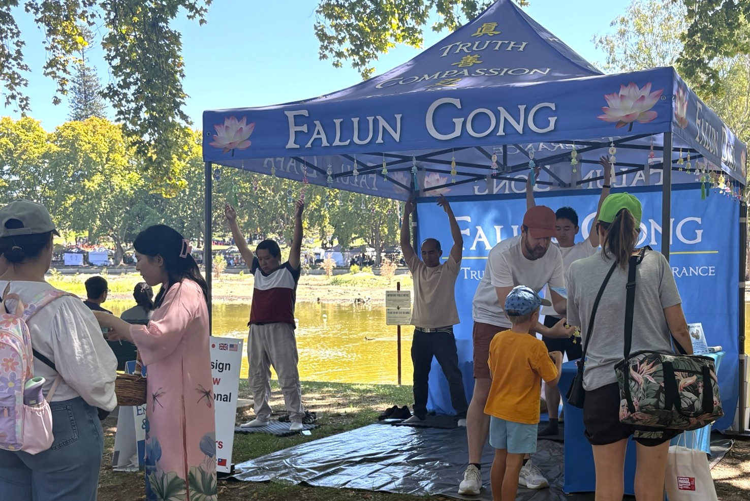 لسلی کولمن (اولین نفر از سمت راست) در غرفه فالون گونگ