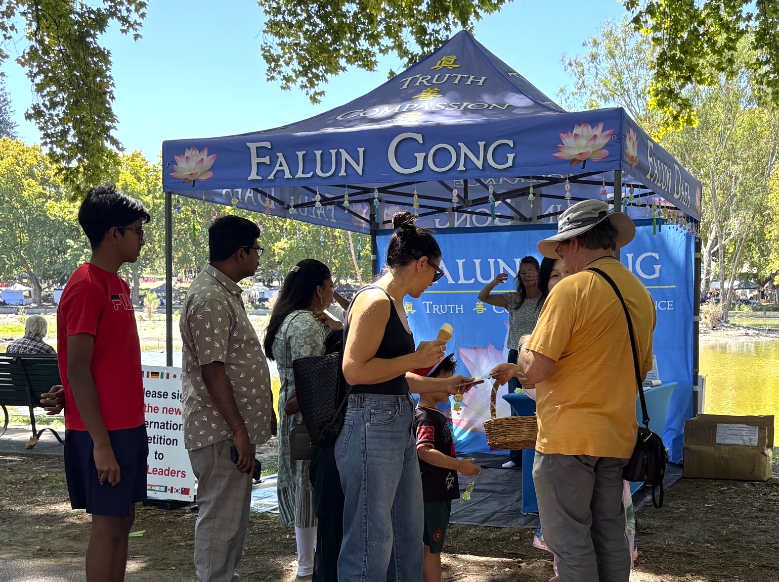 بسیاری از مردم از غرفه فالون دافا بازدید کردند، به معرفی این روش توسط تمرینکنندگان و نحوه آزار و اذیت آن توسط ح.ک.چ گوش دادند. آنها دادخواست پایان دادن به نقض حقوق بشر را امضا کردند.