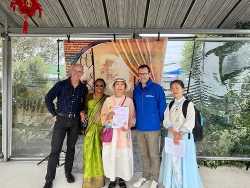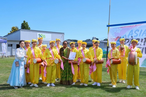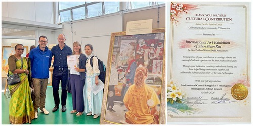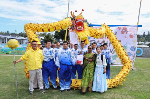 پوشپا پراساد (سمت چپ)، رئیس شورای چندفرهنگی، کارل بیتس نماینده پارلمان (دوم از چپ)، و شهردار اندرو ترایپ (وسط) گواهی قدردانی را به تمرینکنندگان فالون دافا برای مشارکت در نخستین جشنواره آسیا–اقیانوسیه در وانگانوئی اهدا میکنند.