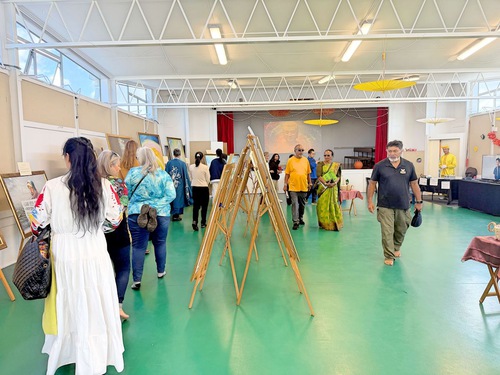 مردم در تالار جشنواره آسیا–اقیانوسیه از نمایشگاه هنر حقیقت، نیکخواهی، بردباری بازدید میکنند.
