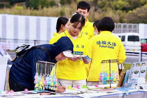 خانم میزونو، که روز قبل با تمرینکنندگان ملاقات کرده بود، صبح روز بعد کوپنهایی برای چای و پذیرایی آورد و آنها را به غرفه چای خود دعوت کرد. پس از آگاهی از فالون دافا و آزار و شکنجه شدید در چین، او دادخواستی را امضا کرد که خواستار پایان دادن به برداشت اعضای بدن افراد زنده توسط ح.ک.چ بود.