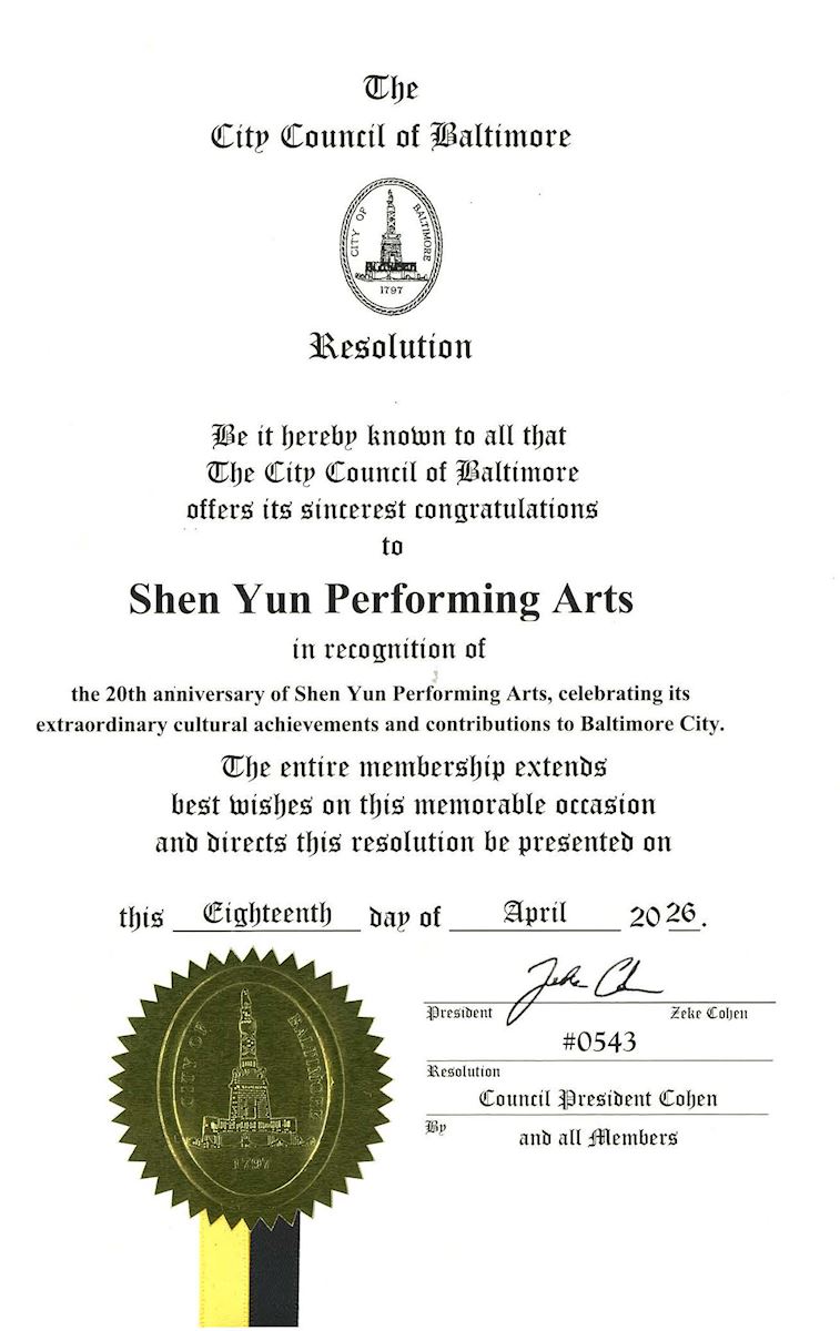 (Minghui.org) با توجه به اینکه شرکت هنرهای نمایشی شن یون قرار است در روزهای ۱۸ و ۱۹آوریل۲۰۲۶ در سالن تئاتر هیپودِروم اجرا داشته باشد، شورای شهر بالتیمور با تصویب قطعنامهای از «دستاوردهای فرهنگی برجسته و مشارکتهای شن یون در شهر بالتیمور» تقدیر کرد.