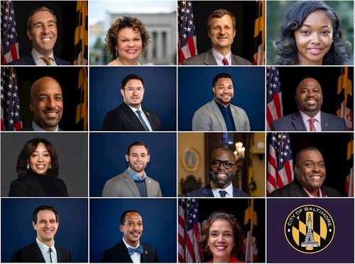 (از چپ به راست، ردیف ۱تا۴) زیک کوهن، رئیس شورای شهر بالتیمور؛ شارون گرین، معاون رئیس؛ اعضای شورای شهر مارک پارکر، دنیل مککری، مارک کانوی، آیزاک «ییتزی» شلایفر، جیمز تورنس، پاریس گری، فایلیشیا پورتر، زک بلانچارد، جرمین جونز، آنتونیو گلاور، رایان دورسی، جان تی. بولوک، و اودت راموس