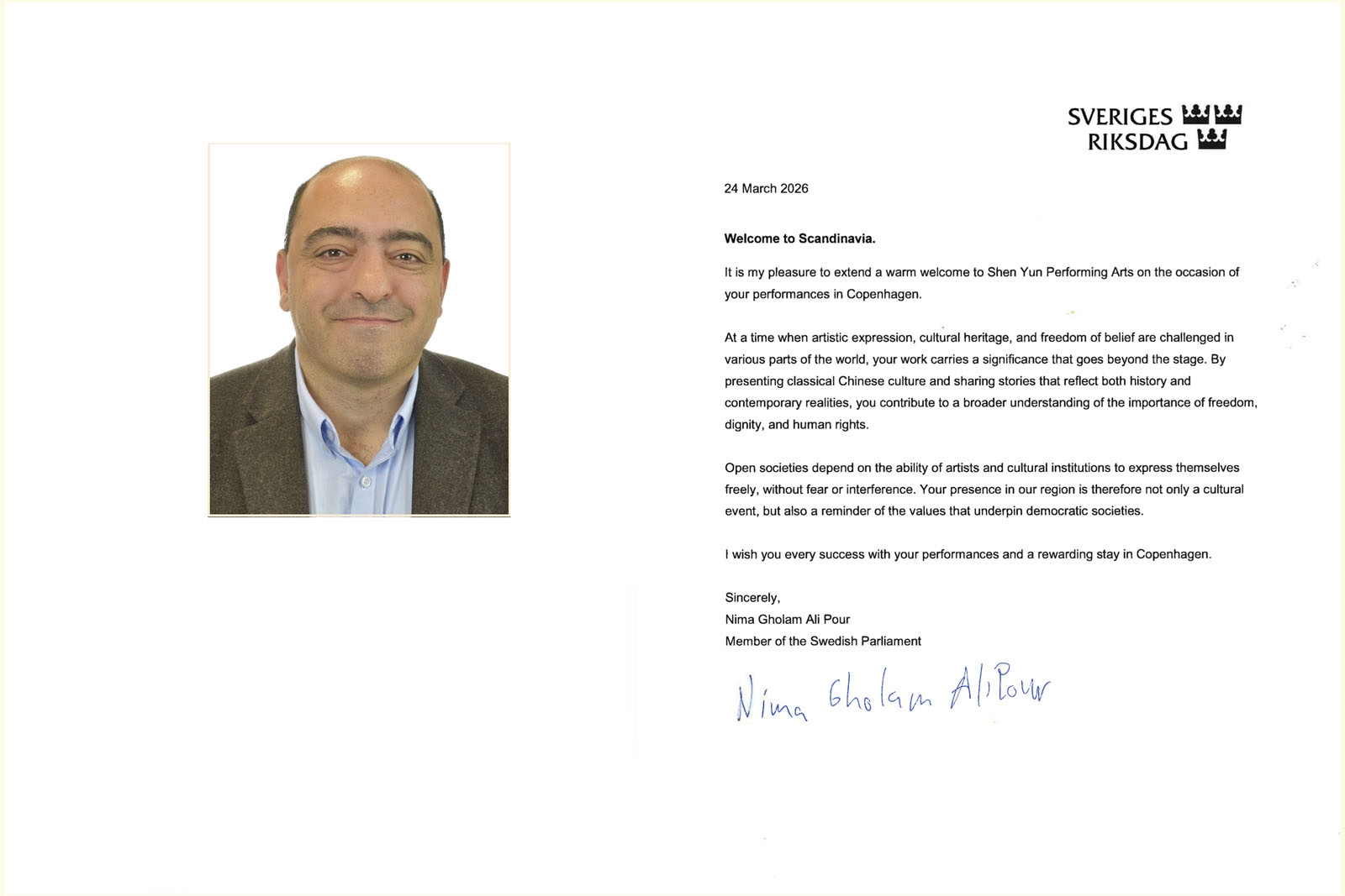 نیما غلامعلیپور، نماینده مجلس، نامهای برای استقبال از شن یون در اسکاندیناوی ارسال کرد.