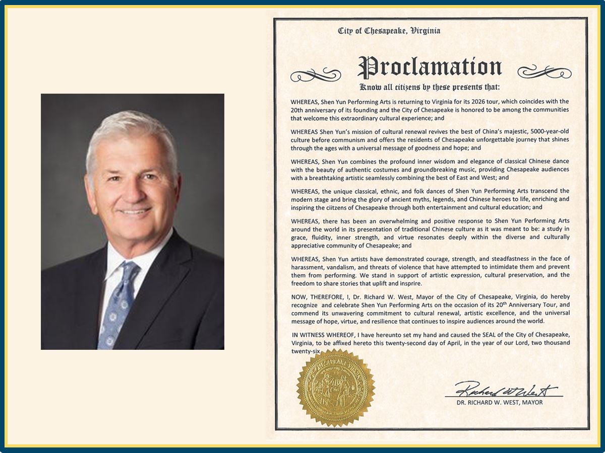 «بنابراین، من، دکتر ریچارد دبلیو. وست، شهردار شهر چساپیک (ایالت ویرجینیا)، بدینوسیله هنرهای نمایشی شن یون را بهمناسبت تور بیستمین سالگرد آن بهرسمیت میشناسم و از تعهد پایدار آن به احیای فرهنگی، برتری هنری و پیام جهانی امید، فضیلت و پایداری که همچنان الهامبخش مخاطبان سراسر جهان است، قدردانی میکنم.»