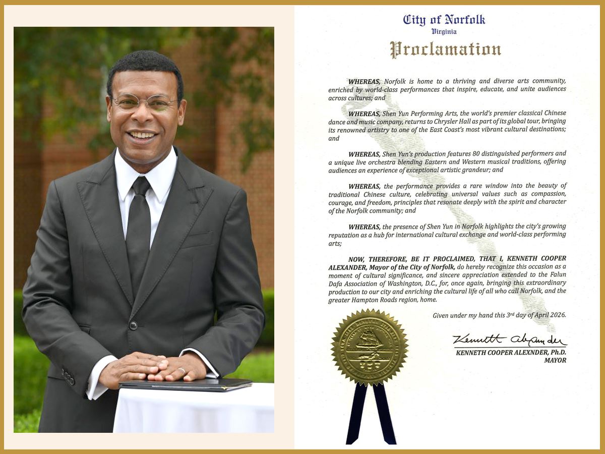 «بنابراین، اعلام میشود که من، کنت کوپر الکساندر، شهردار شهر نورفک، بدینوسیله این مناسبت را بهعنوان لحظهای با اهمیت فرهنگی بهرسمیت میشناسم و قدردانی صمیمانه خود را از انجمن فالون دافای واشینگتن دی.سی. ابراز میکنم، بهخاطر آنکه بار دیگر این تولید خارقالعاده را به شهر ما آورده و زندگی فرهنگی همه کسانی را که نورفک و منطقه بزرگتر همپتون رودز را خانه خود میدانند، غنا بخشیده است.»