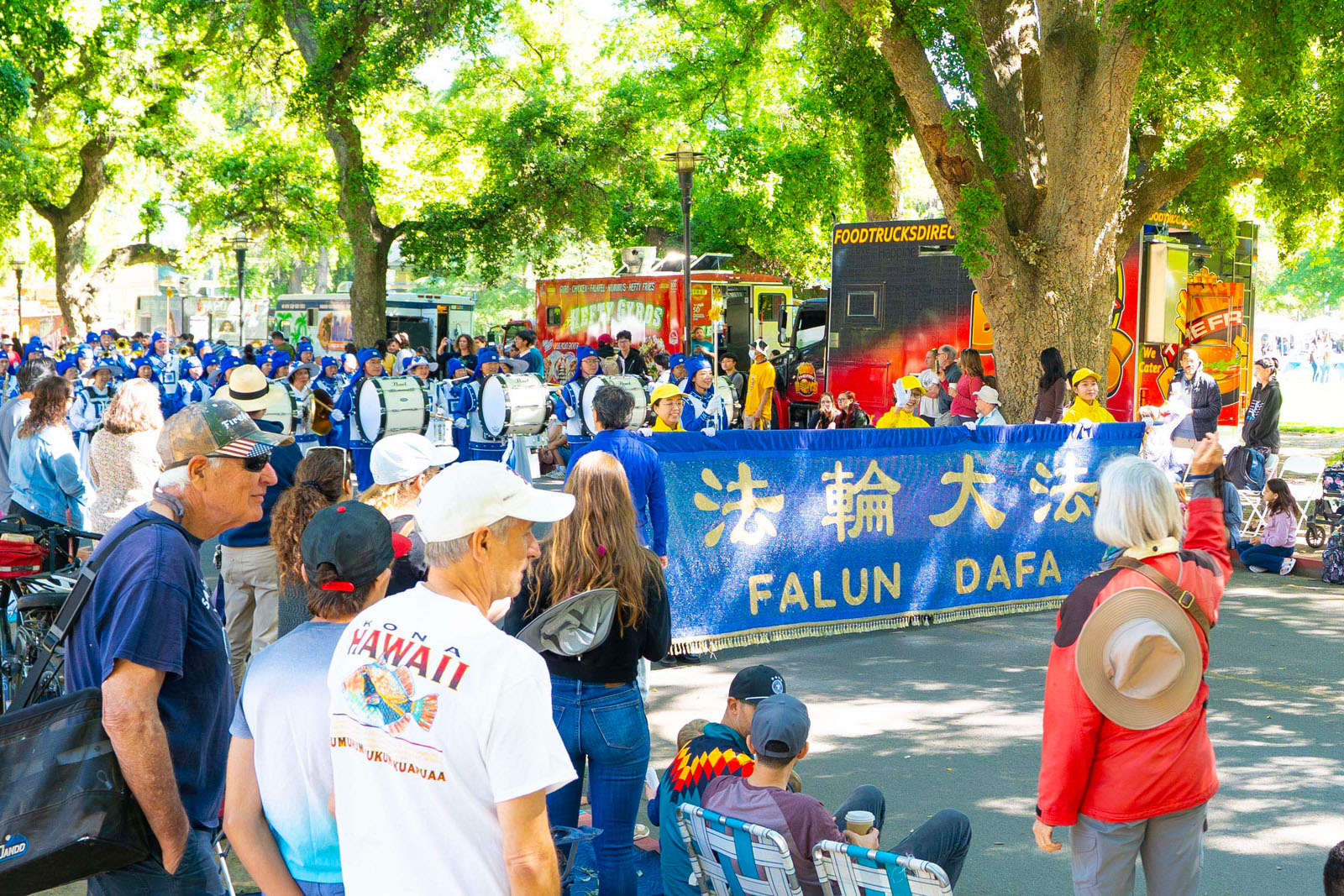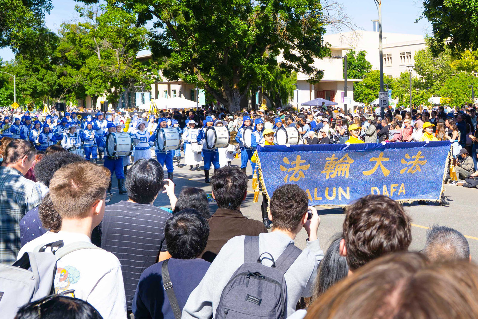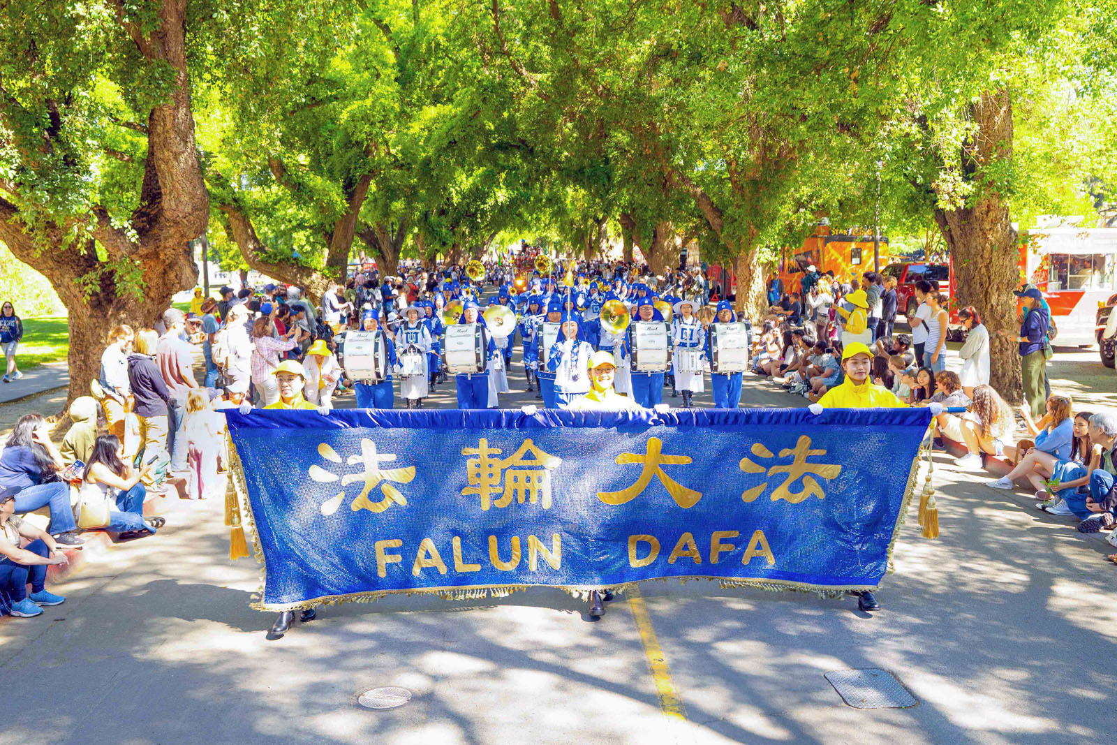 هنگامی که گروه مارش تیان گوئو از مقابل جایگاه عبور کرد، مجری آنها را معرفی کرد و توضیح داد که اعضای این گروه فالون دافا را تمرین میکنند که یک روش تزکیه براساس اصول حقیقت، نیکخواهی، بردباری است.