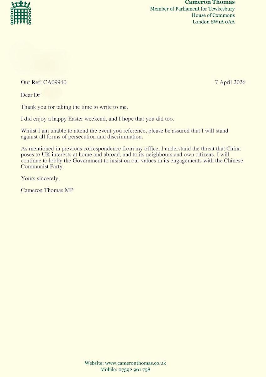 کامرون توماس، نماینده پارلمان، نوشت: «اطمینان داشته باشید که من در برابر همه شکلهای آزار و شکنجه و تبعیض خواهم ایستاد، همانطور که در مکاتبات پیشین دفتر من ذکر شده است، من تهدیدی را که چین برای منافع بریتانیا در داخل و خارج از کشور، و برای همسایگان و حتی شهروندان خود ایجاد میکند، درک میکنم. من همچنان به تلاش برای ترغیب دولت ادامه خواهم داد تا در تعاملات خود با حزب کمونیست چین (ح.ک.چ)، بر ارزشهای ما پافشاری کند.»
