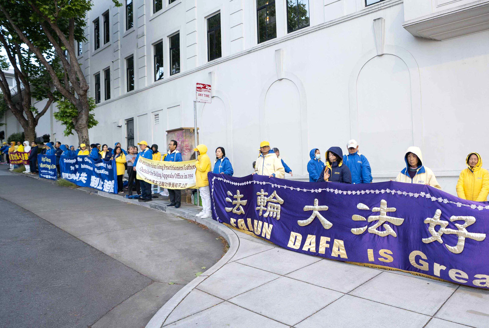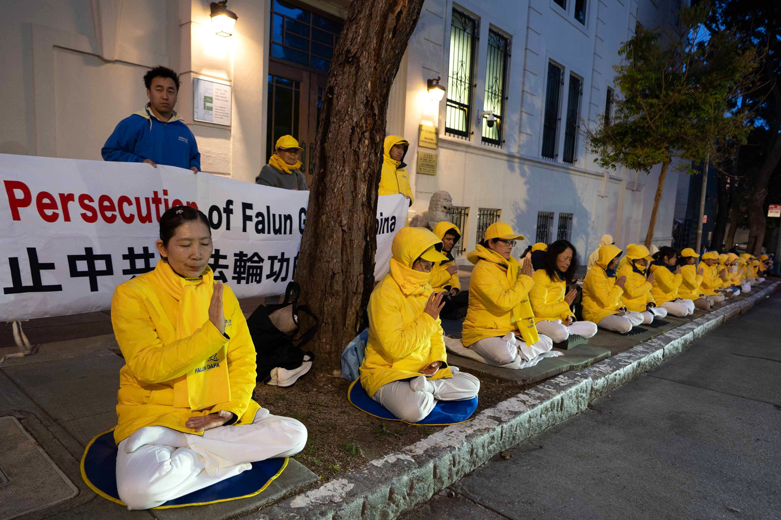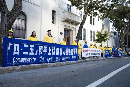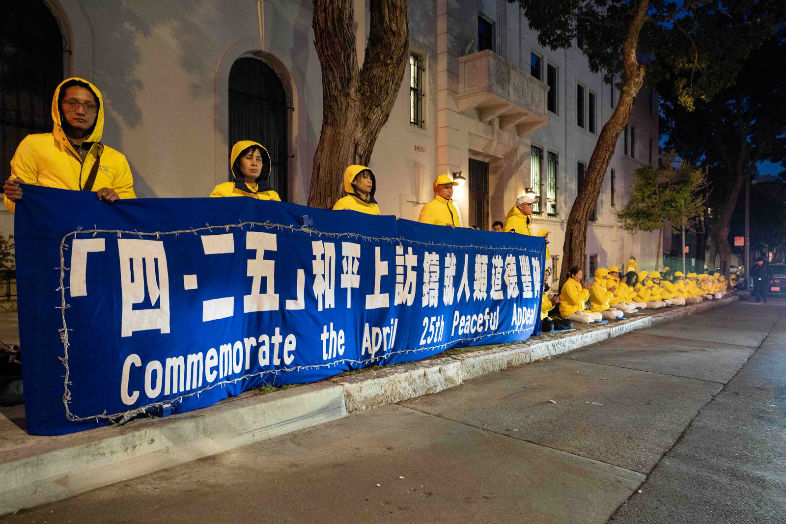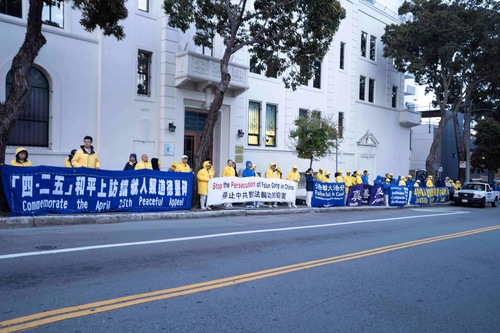 تمرینکنندگان در منطقه خلیج سانفرانسیسکو در ۲۴آوریل۲۰۲۶، تجمعی را در مقابل کنسولگری چین برگزار کردند تا دادخواهی ۲۵آوریل را گرامی بدارند.