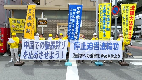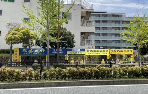 تمرینکنندگان از منطقه کانسای در ۲۱آوریل در مقابل کنسولگری چین در اوزاکا گرد هم آمدند. آنها بنرهایی را به نمایش گذاشتند و از ح.ک.چ خواستند فوراً آزار و شکنجه فالون گونگ را متوقف کند و به برداشت اعضای بدن تمرینکنندگان زنده پایان دهد.
